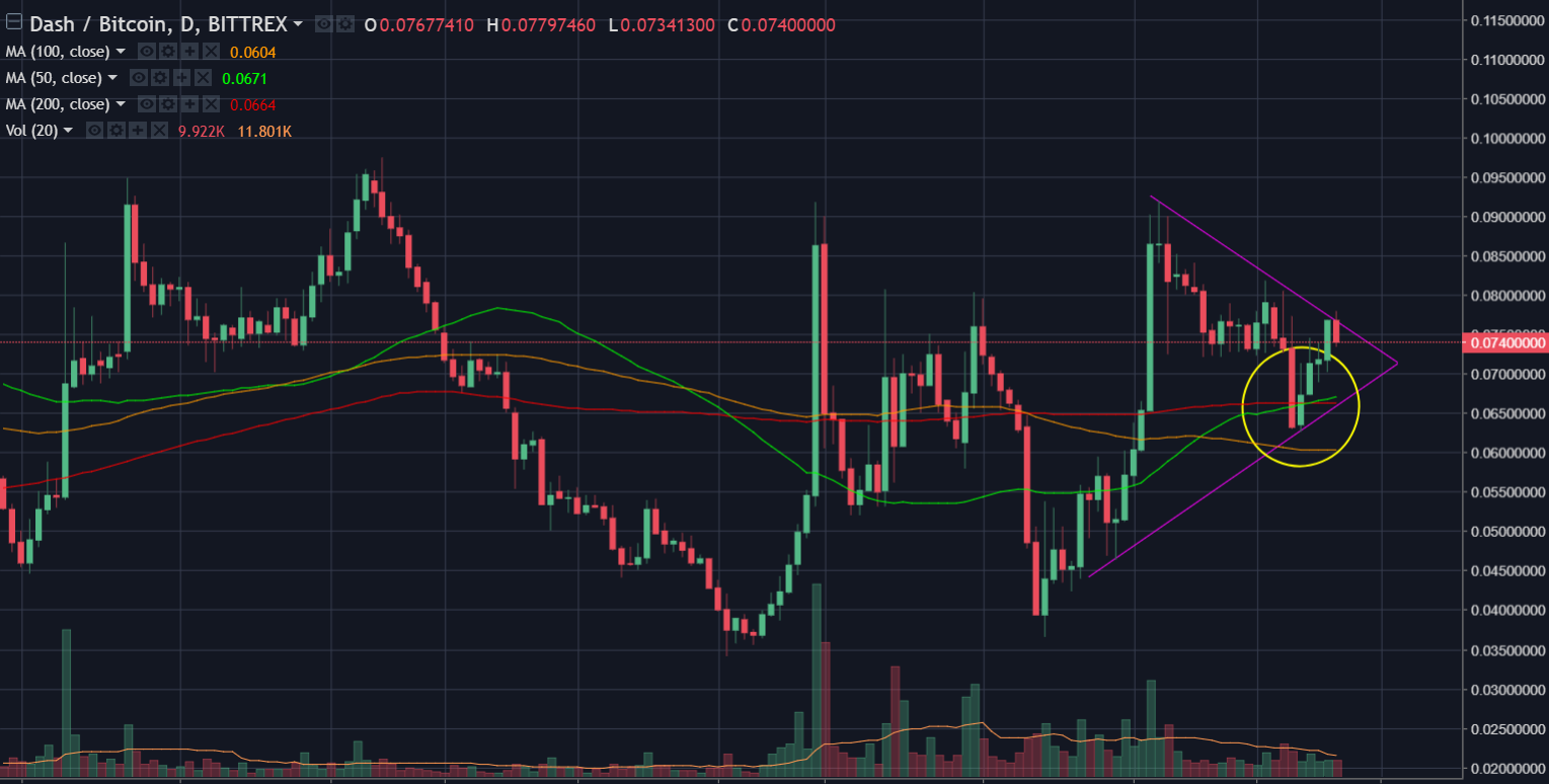 A symmetrical triangle has formed on the daily chart that gives traders a day or so to watch the price action and volume closely before making a move, but this could be an indicator that we are about to see Dash make a fundamental move upward.