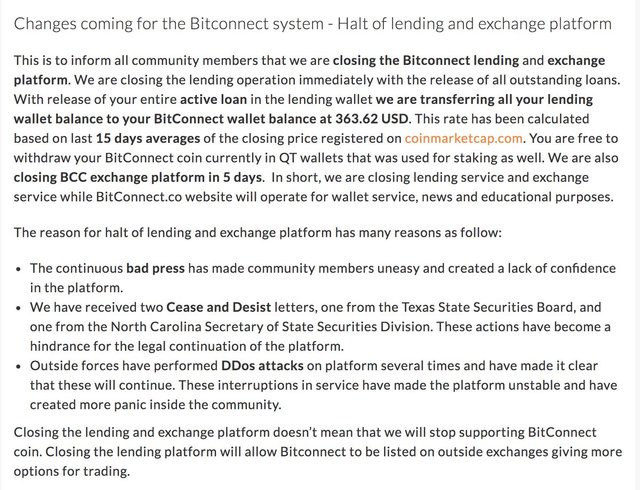 [cryptomonitor NEWS] BitConnect is dead - its lending and exchange platform shutts down OMG !!!! IT'S OVER !