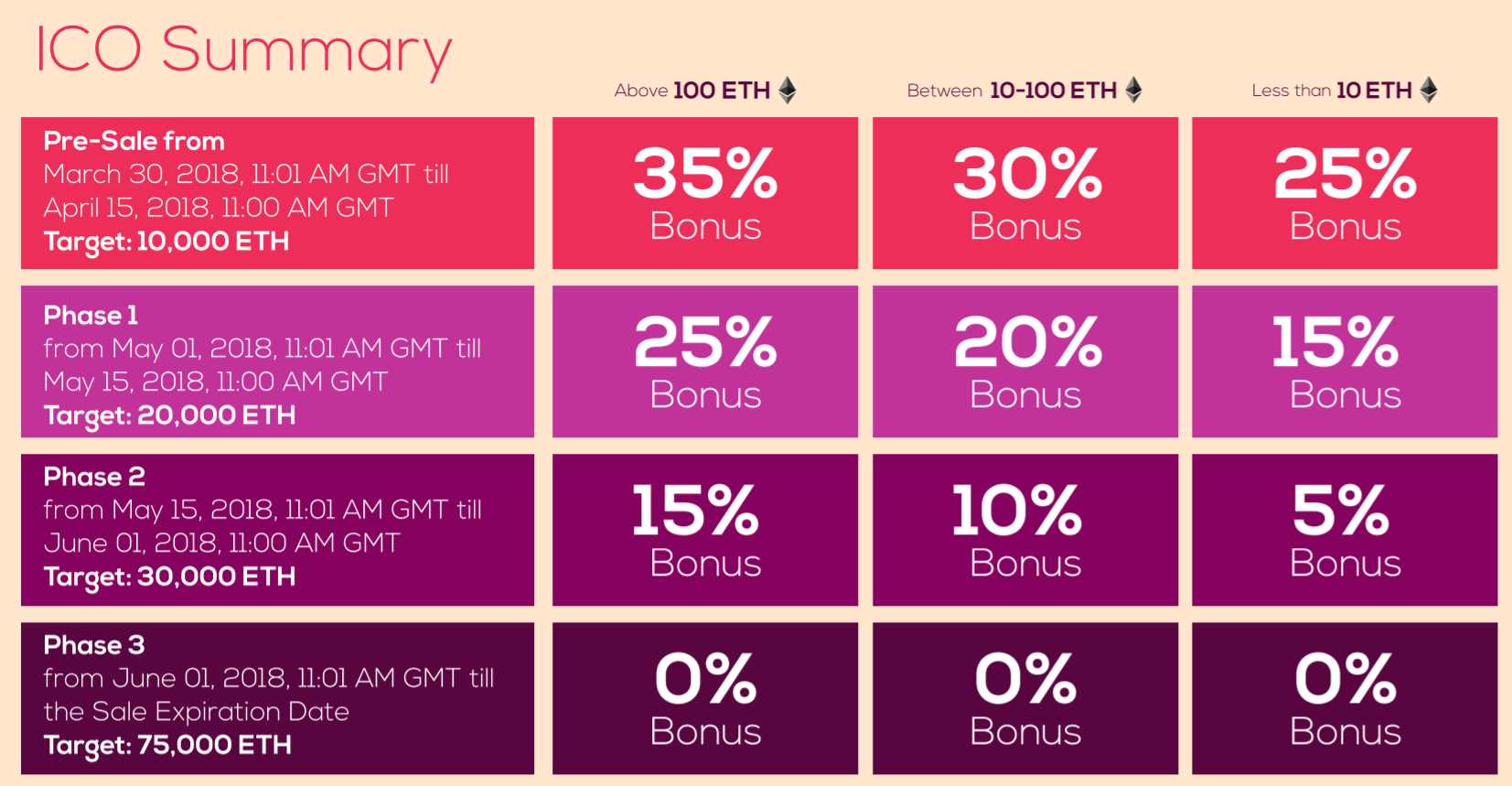 All the contribution will be accepted in ETH and there’s also a bonus program on Pre-ICO crowd sale:
