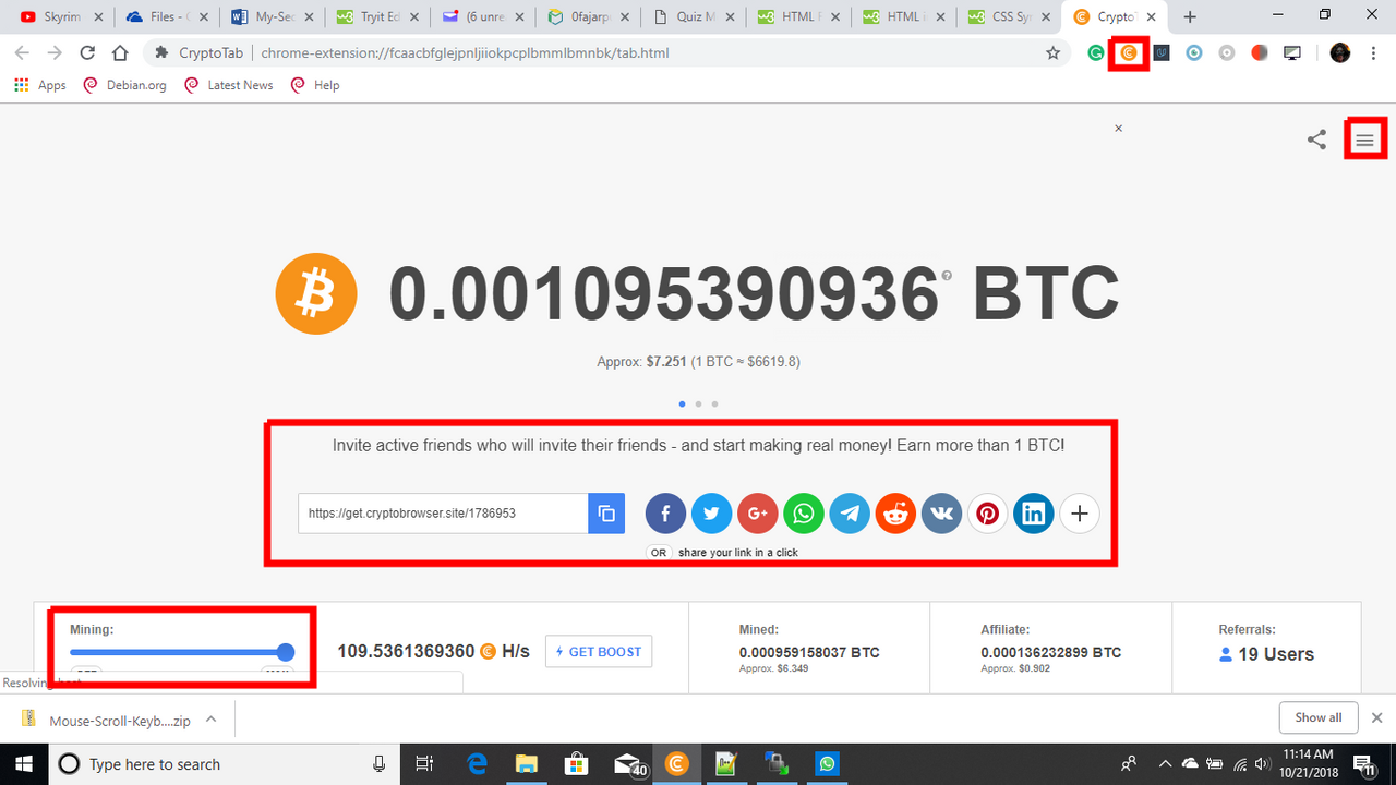 Cryptotab Browser is a fork of Chrome browser with a CPU javascript miner built. In other words all the browsing features are based on chrome with an additional feature to mine and earn bitcoin (BTC). Browse casually such as searching in Google, watching movies in Youtube, interract in Facebook and Twitter, while mining.