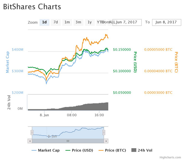HOLDERS (and HODLers) of BitShares had reason to smile : ) today as the coin raked in a cool 24 hour-profit of around 35% for it's possessors. Below is the 24-hour chart: