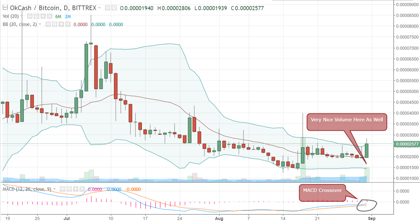 Comment: OK Cash has formed a very attractive green candlestick today and in addition to the high volume and MACD crossover, I think this coin has some great potential, at least a 2x return on your investment.