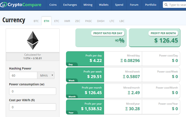 Source: https://www.cryptocompare.com/mining/calculator/eth?HashingPower=60&HashingUnit=MH%2Fs&PowerConsumption=0&CostPerkWh=0