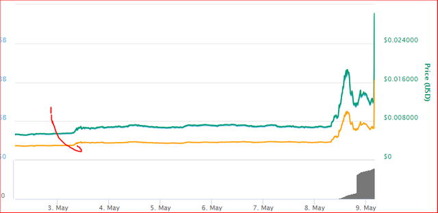 As you can see the price movement started just a week before the listing. Then there's accumulation period for 7 days and after that the pump started. This was obviously well planned as the team had already show intention in one of their tweets recently. Here's the link https://twitter.com/Bytecoin_BCN/status/991951839682793473