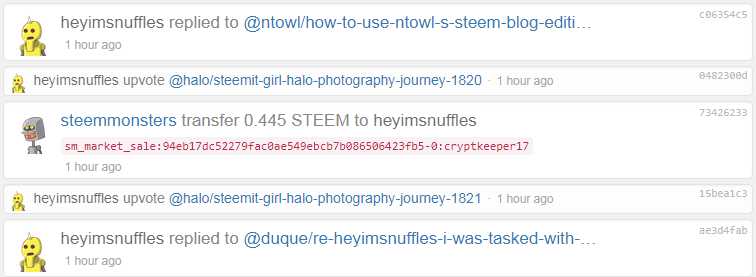 You can see there is alot of GREAT information on steemd. I will walk you through some of the information here. On the right side of the page are ALL of the most recent transactions relating to your account. Everyone that has been posted in a block including, votes, comments, replies, rewards, transfers, follows, unfollows, etc. When you click on the transaction number i nthe top right of the little box it will take you to the transaction in the actual block this was posted in. This is full transparency of EVERYTHING that occurs on the steem blockchain!