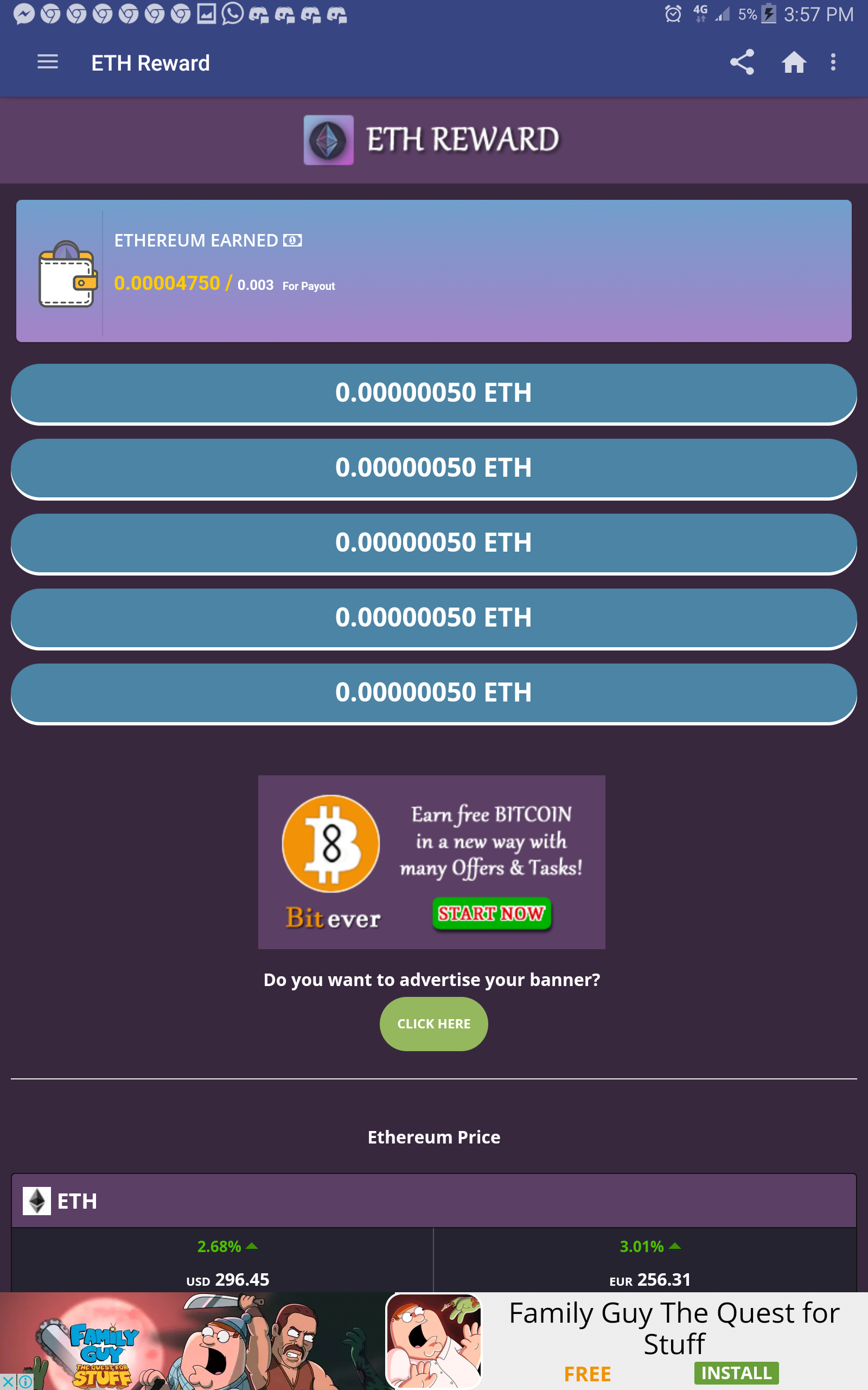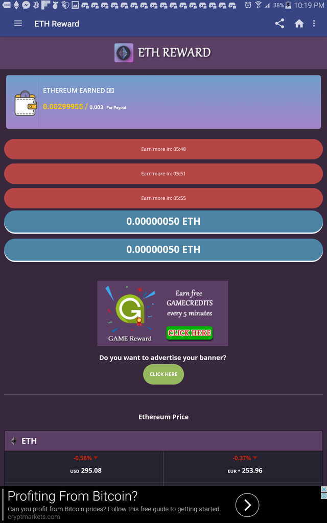 if you are not impatient , this free mining apps can be yours. For payout, at first you need to provide your own Eth Wallet Address then you can start clicking. Once you reached the 0.00300000 it will automatic transfer to your account. The amount is not so big but at least you have a free ETHEREUM.