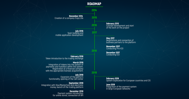 Enjoy Life adalah team yang terdiri dari 20 peminat dan profesional yang bekerja sama di tahun 2014 untuk menghilangkan hambatan antara Komunitas Kripto dan ekonomi tradisional.Pada tahun 2017, upaya kami diwujudkan dalam pembuatan aplikasi untuk smartphone, yang menggabungkan sistem pembayaran, diskon dan platform perdagangan.