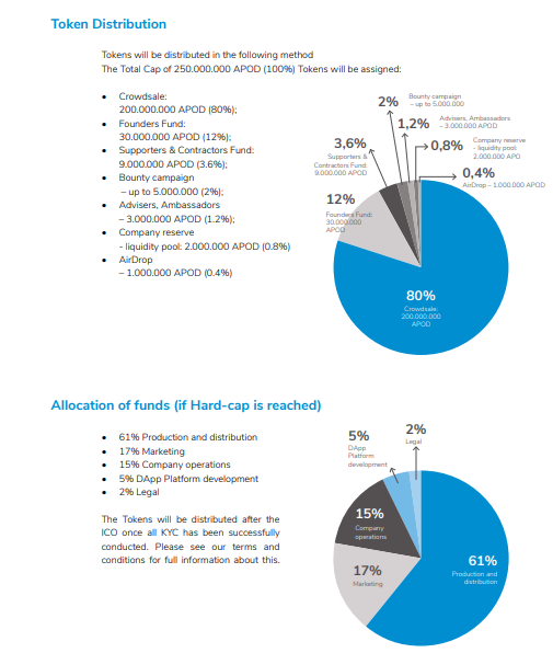250,000,000 APOD Tokens are created for the project in which 80% of the tokens are reserved for the ICO. 61% OF THE funds will be utilised in the production and distribution of the project. The team is ready for the market as they believe in the product they are developing. Experience in the engineering and design of the products is going to help them realise their project in coming years.