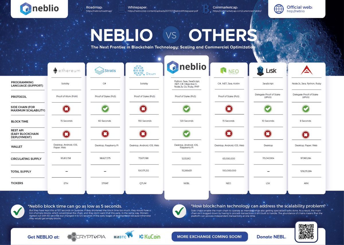 Neblio is at $34 Million market cap at this moment and after making your own due diligence I am sure that you will realize that Neblio is not in any segment inferior to its competitors but even superior in some parts. The main advantage of Neblio platform is a number of programming languages that he will offer. While competition usually has just one or few at the best, Neblio is allowing the use of Python JS .NET (C# & VB.NET) Objective-C Java Node.Js Go PHP. A suite of RESTful APIs, in almost all of the today’s popular programming languages, will allow developers to intuitively interact with the Neblio blockchain network without having to know the complex details of blockchain technology.