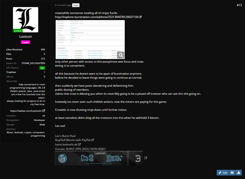 the funds were stolen by a member of www.burstnation.com called focus and has now brought the miners into the casualty's of this war. which so far has led to defaming and shaming crowetic a former admin of the site and also publicly doxing members of the forum.