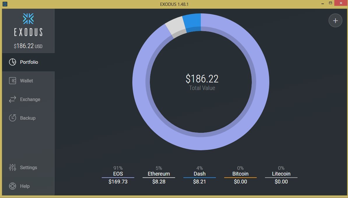 Exodus desktop wallet – Portfolio holdings (main screen)