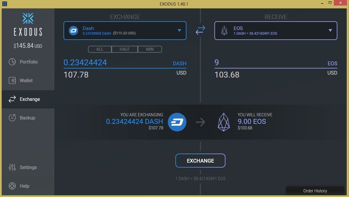 Exodus desktop wallet – example of trading one kind of crypto for another
