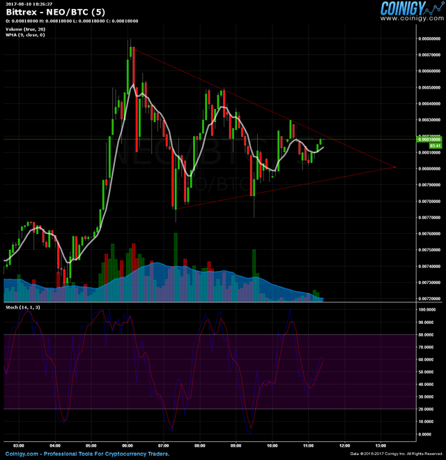 I've spent the last week, and the entire night trading NEO to some amazing success, however have begun to notice some patterns, and what appears to be a possible consolidation point which could either mean we drop back down in price to pre-meteoric levels, or we will break out even more. I sold half my holdings so I could make away with a profit in the event of a massive price consolidation, however I also kept half my NEO holdings in case we experience a massive breakout.