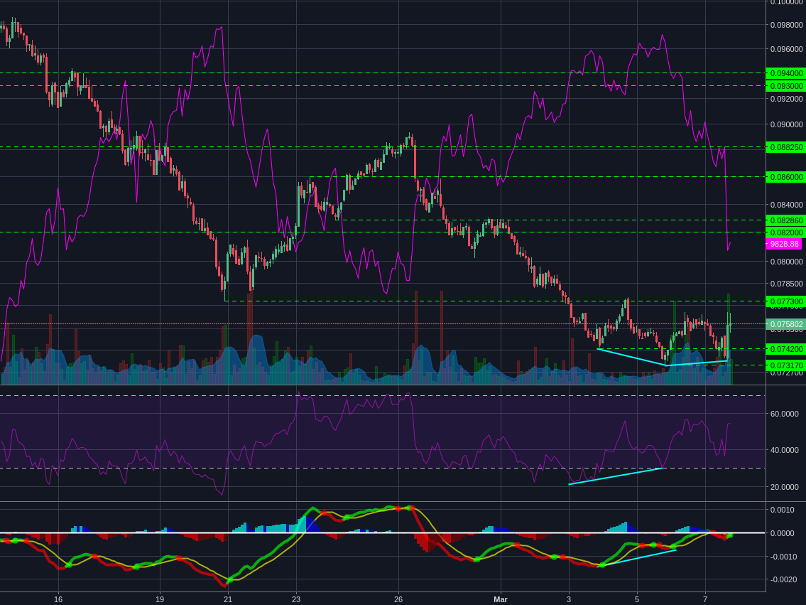 Neo continued its drop past 0.010363 to find some support around 0.009500 after some more bullish divergence on the RSI and MACD. This level is particularly notable, as it marks the 127% fib extension of the previous bearish leg. This is a common maximum extension for a movement. If we can hold this support level, then we can start looking for new bullish positions.