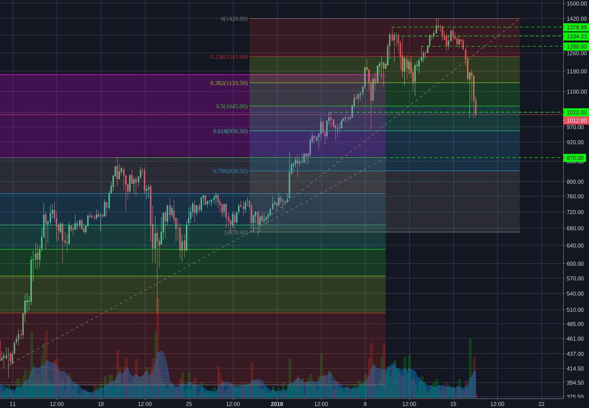 Following in the footsteps of Bitcoin, Ethereum has also seen a major drop today. We're seeing some support around the $1000 level, however another leg down for Bitcoin will likely bring Ethereum down with it. In the short term, the 61.8% support is the nearest level followed by the major historical support at $870. A break below these levels could show weakness in this longer term bull trend.