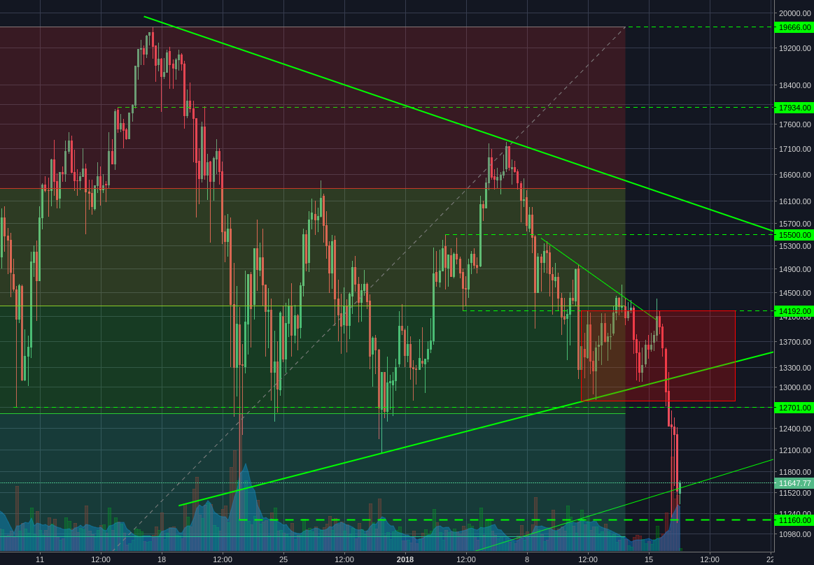 After another failed attempt to break upwards from the flat channel, bitcoin broke through its major support in spectacular fashion. We've found short term support around $11160, which was the level of the major drop after reaching ATH. So far the support in this area has been very strong, with several sharp rejections. However, each appears to be weaker than the last.