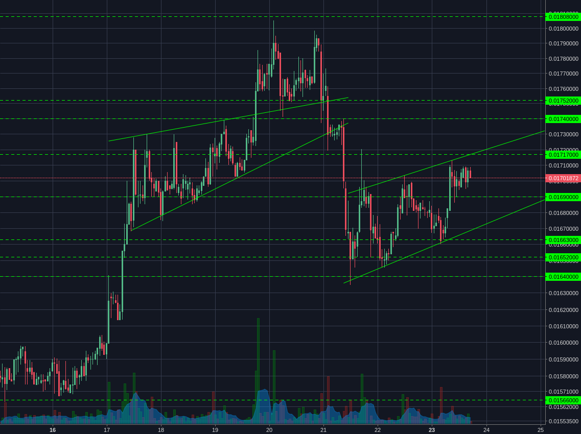 Litecoin appears to be forming an ascending channel/ bear flag after its bounce from support. This is considered a bearish continuation pattern however, due to the spiky nature of the volume, its hard to confirm. For this reason, I wouldn't advise shorting, instead its best to wait and see how we respond to the 0.01640 support if/ when the pattern breaks down.