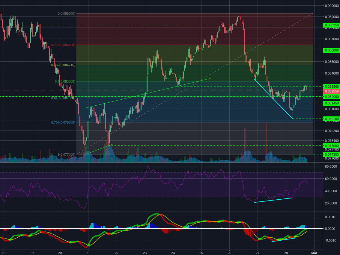 Neo saw a pullback to the 50% support of the recent movement. Volume remains fairly high, so I would wait for it to drop off along with a second bounce from support before looking for positions. There is also the possibility that this forms a descending wedge, but we'd need another bounce lower to form a descending support.