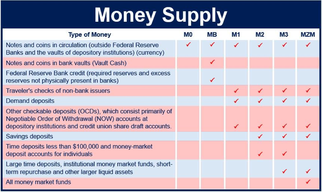 The above pictures show the modern definition of money, and how money as a technology works in a modern economy such as the United States. The designations M0, M1, M2, and M3 correspond to different measures of the overall money supply, different currency mediums that people have adopted and the way they interact with financial institutions. Money in bank notes and coins is designated M0; this covers only a small part of the overall money supply, and only a small percentage of the total value people are paying with and sending to each other in modern societies. Chart 2 shows the growth of different levels of the overall money supply over time, and they do not all move together. When the economy collapsed in 2008, M1 was still expanding due to the expansionary monetary policies of the Federal Reserve. The private sector was contracting, however, and consequently M3 growth contracted.