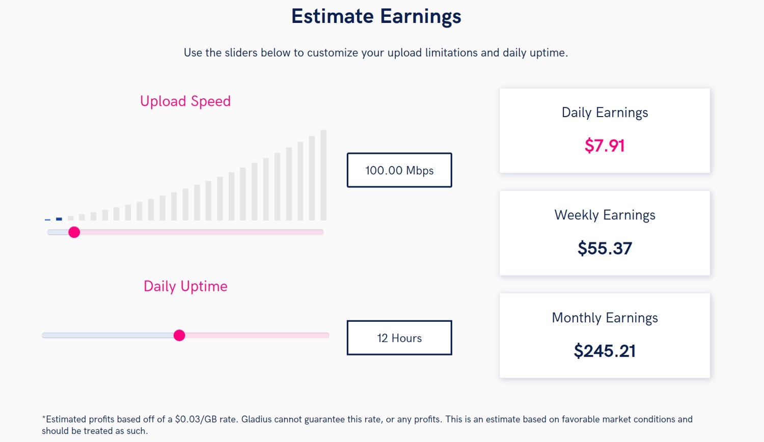 I had a look at the Gladius bandwidth calculator and it estimates that I could go a long way to reducing my internet bill by leasing out my unused bandwidth to the Gladius Network.I could perhaps even make it pay for itself.