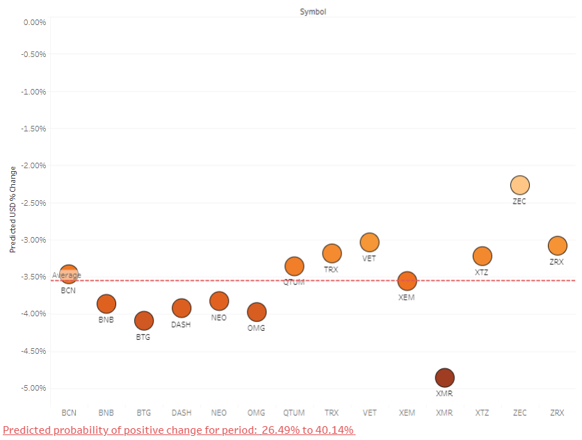 By interacting with the charts and hovering over a specific coin, you can also view the % predicted chance of a positive increase in relative USD price during the time period. This is calculated independently by a different model than the % USD change predictions.