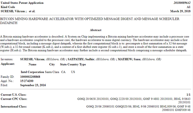 Back in 2016 already Intel filed a patent called "Bitcoin Mining Hardware Accelerator" that now has been released.