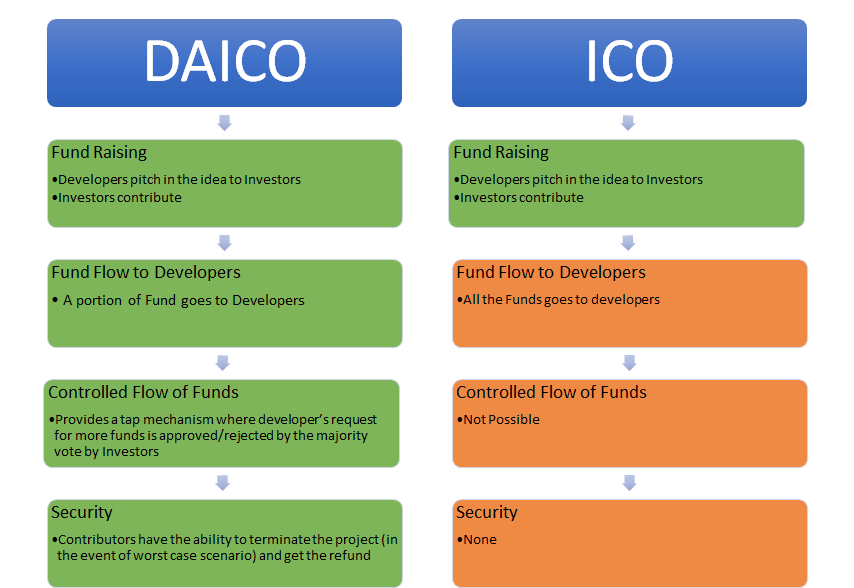 Decentralized Autonomous Initial Coin Offering. DAICO is a solution which is similar to ICO but gives more control to the Investors on how much funds flows into the hands of the Developing Team. The Key feature in DAICO is called aTap Mechanismwhich set the limit on how much funds should flow to Developers. This Tap can also be increased by conducting a voting system where only the investors get to vote and the majority vote will determine whether the tap needs to be increased or not. I have put together a comparison below for a easier understanding.