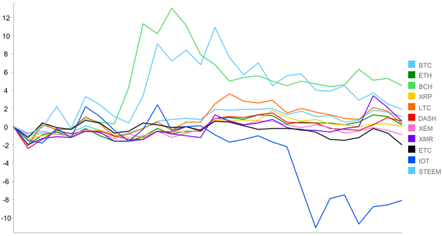 Graph: 24 hour percent change for top market cap coins (plus STEEM)