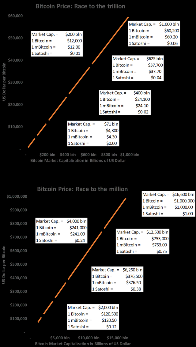 Unlike other cryptocurrencies that may have more sophisticated uses, like smart contracts for Ethereum, Bitcoin’s main uses are being a store of value and a medium of exchange. Its competitors are therefore the established main fiat currencies (US Dollar, Euro, Yen) and Gold. If the Bitcoin price already assumed massive adoption, the market capitalization of all Bitcoins should be close to that of the US Dollar and Gold, right? It turns out that nothing could be further from reality. While the market capitalization of Bitcoin is currently $90 bln, the money supply of the US Dollar, i.e. M2, cash, deposits and money market funds, is $12,500 bln while the value of all the gold ever mined is close to $8,000 bln. This means that Bitcoin is only worth around 1% of the value of its two main competitors.