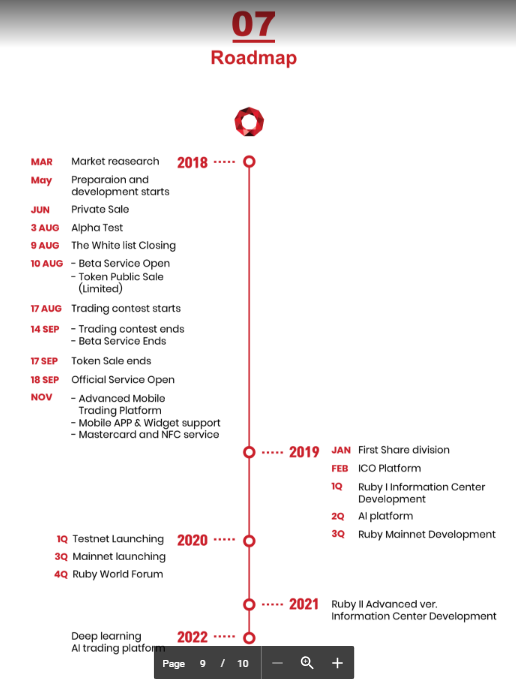 Ruby-x is aiming to build an ecosystem based on its own main net of POC. RBY will be used as RUBY main net’s main currency to constitute the decentralized ecosystem. All fees on Ruby-x will be paid with the key currency of Ruby-x, RBY, and it will eventually replace USDT, ETH, and BTC. Once the service is released, RBY can be exchanged with any other listed cryptocurrencies. Also, the top 5000 RBY holders will be shared the profits of Ruby-x, receiving 40% of profits or 10% of revenue, every quarter of each year. Only 11% of the total supply is open for the public on this sale; 200 million Ruby tokens out of 20 Billion will be on sale with no soft cap.
