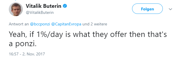 Even Ethereum founder Vitalik Buterin commented on BCC about four weeks ago on Twitter, saying he considers BitConnect a pyramid scheme: