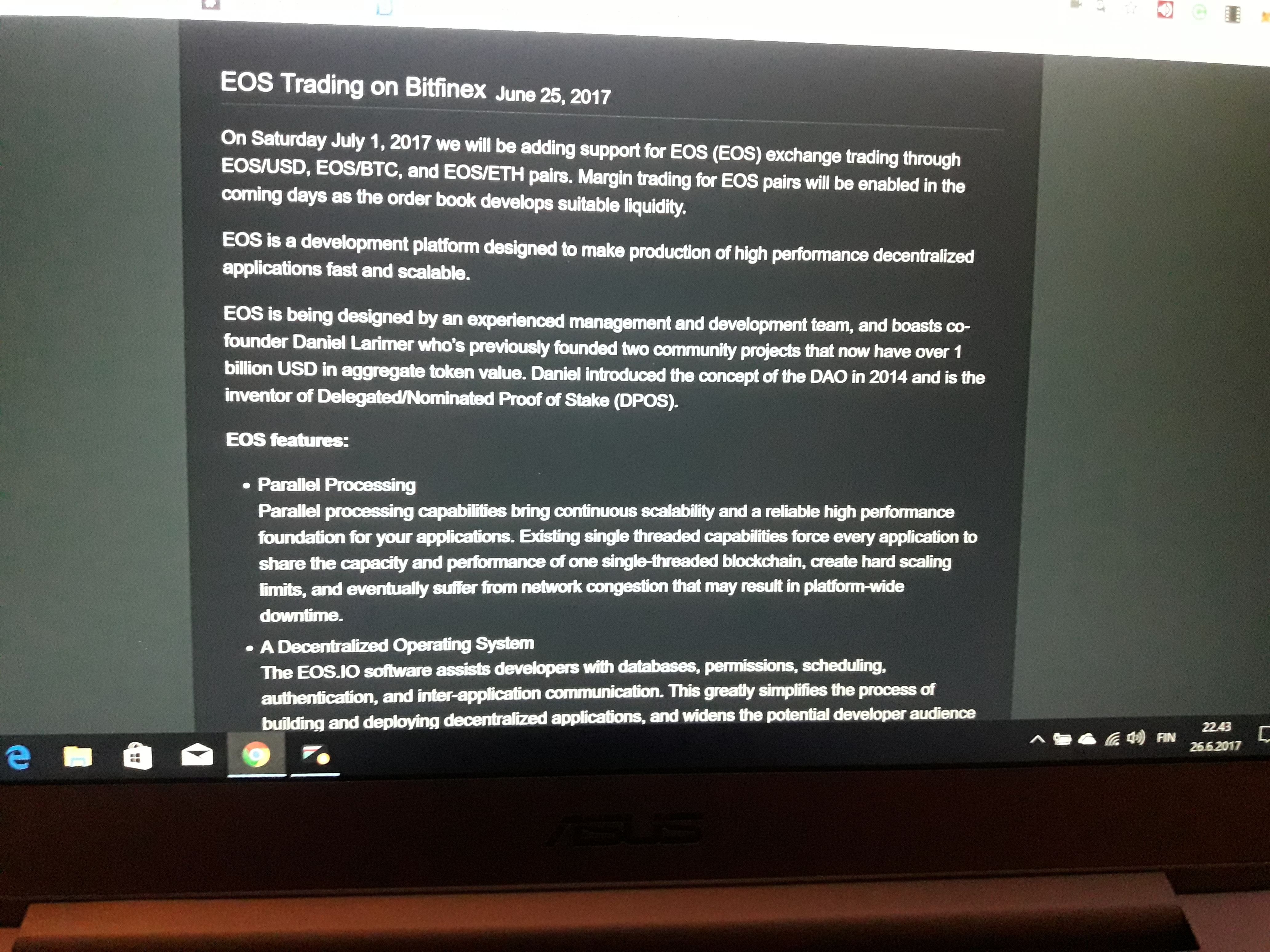 On Saturday July 1, 2017 we will be adding support for EOS (EOS) exchange trading through EOS/USD, EOS/BTC, and EOS/ETH pairs. Margin trading for EOS pairs will be enabled in the coming days as the order book develops suitable liquidity.