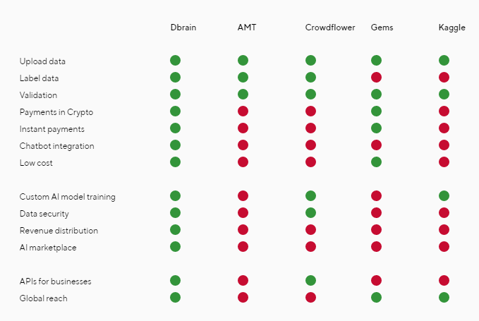 Commonly used existing crowdwork platforms fails to fulfills AI developers’ needs. The need of developers is to find raw data and upload tasks or legalize data themselves. In order to train models and form AI Apps, developers require access to AI compute infrastructure. And developers need to setup AI apps somewhere to make them existing to business clients. The DBrain platform covers all stages of the AI production cycle and offers a complete solution.