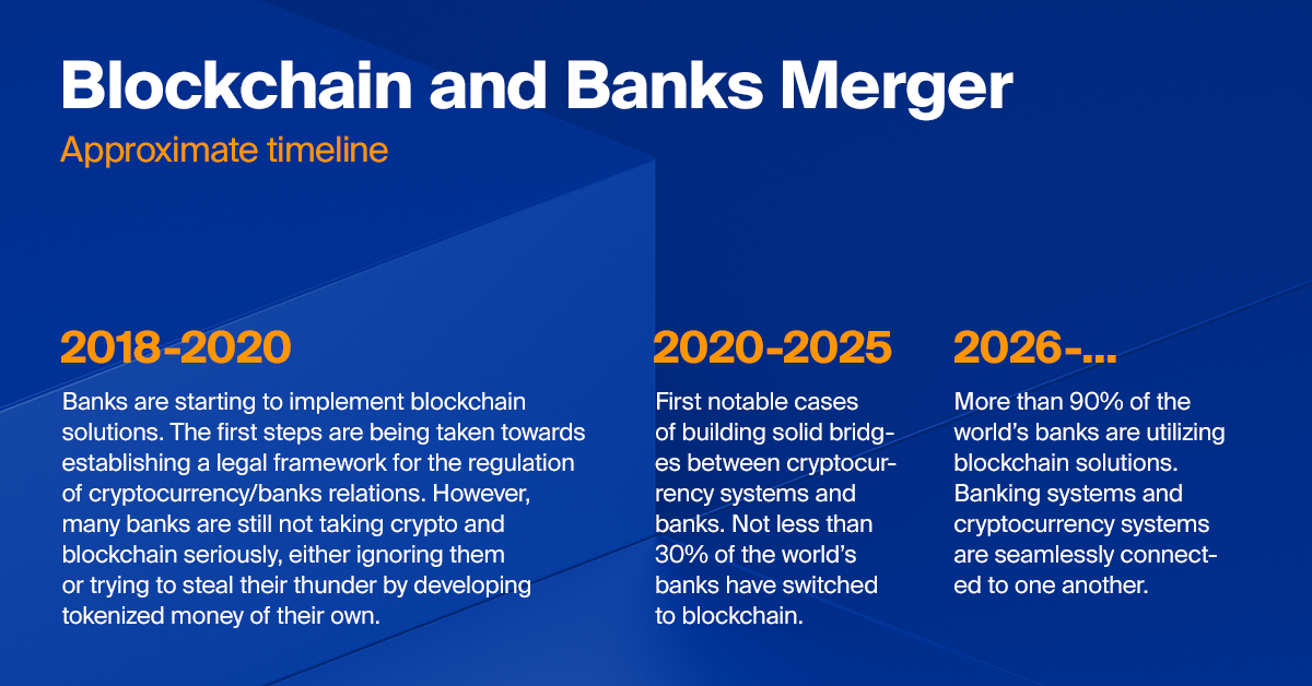 But, as usual, the entities around which the whole argument revolves are actually getting along with one another pretty well. How come? The thing is that the blockchain/banks relationship is complex and cannot be treated as a matter of one replacing the other. Rather, this is a gradually evolving merger with many different aspects — some of which we consider below.