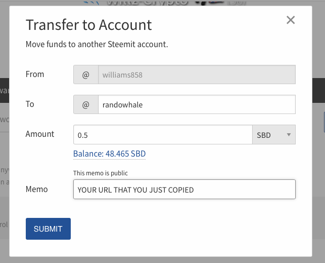 2. Go to your personal wallet on steemit.com, click on the SBD tab, you will see a tab called transfer, click on this and put in the following details including your URL you just copied. As follows!