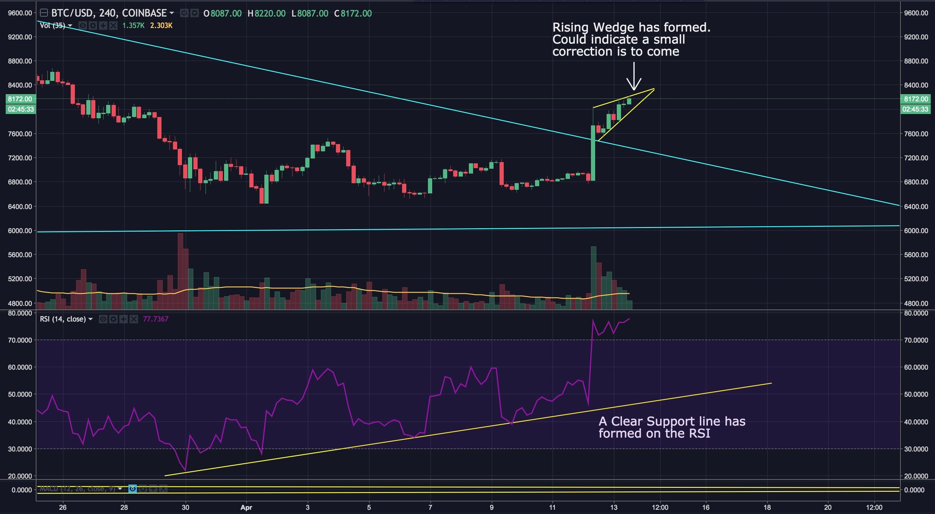 This is a good sign. In the short term, we might see a pullback, possibly to retest the former resistance line on top of the descending triangle, which is now acting as support. We can see a clear bearish rising wedge that's formed as well as a strong support line on the RSI. This support line must hold.