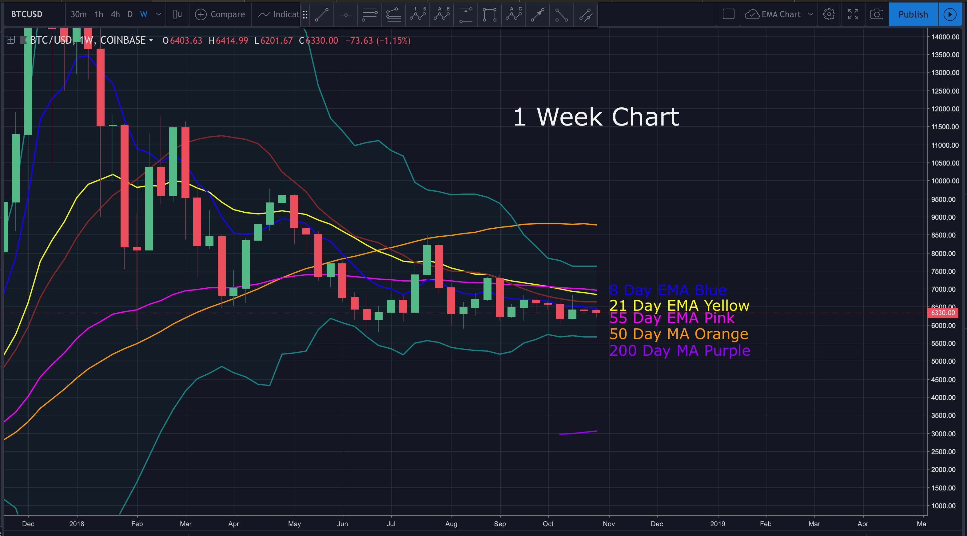 The weekly chart reveals the Bollinger bands bottlenecking, as well as the 8, 21 and 55 day EMA all converging. This also suggests a larger move to come.
