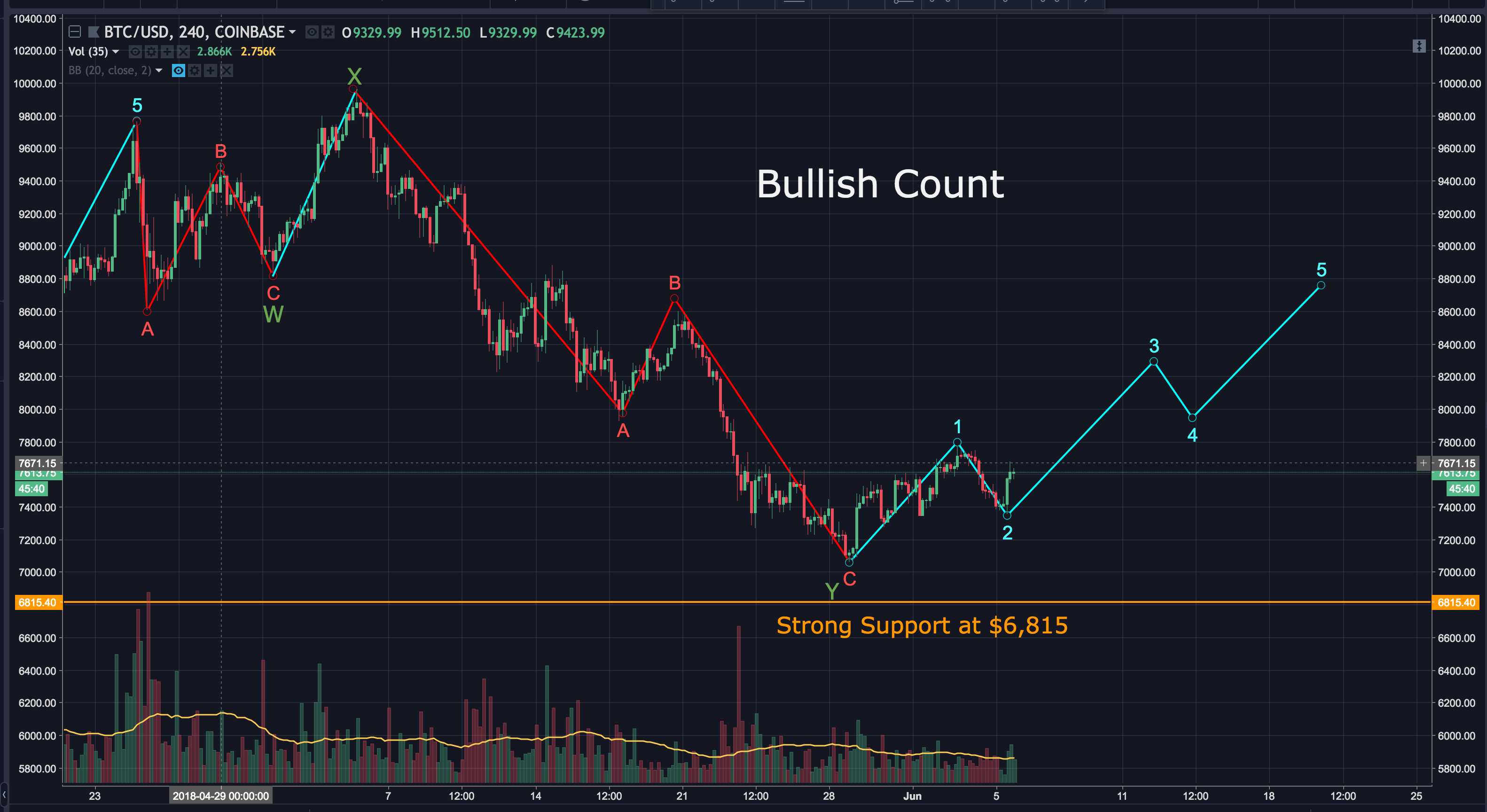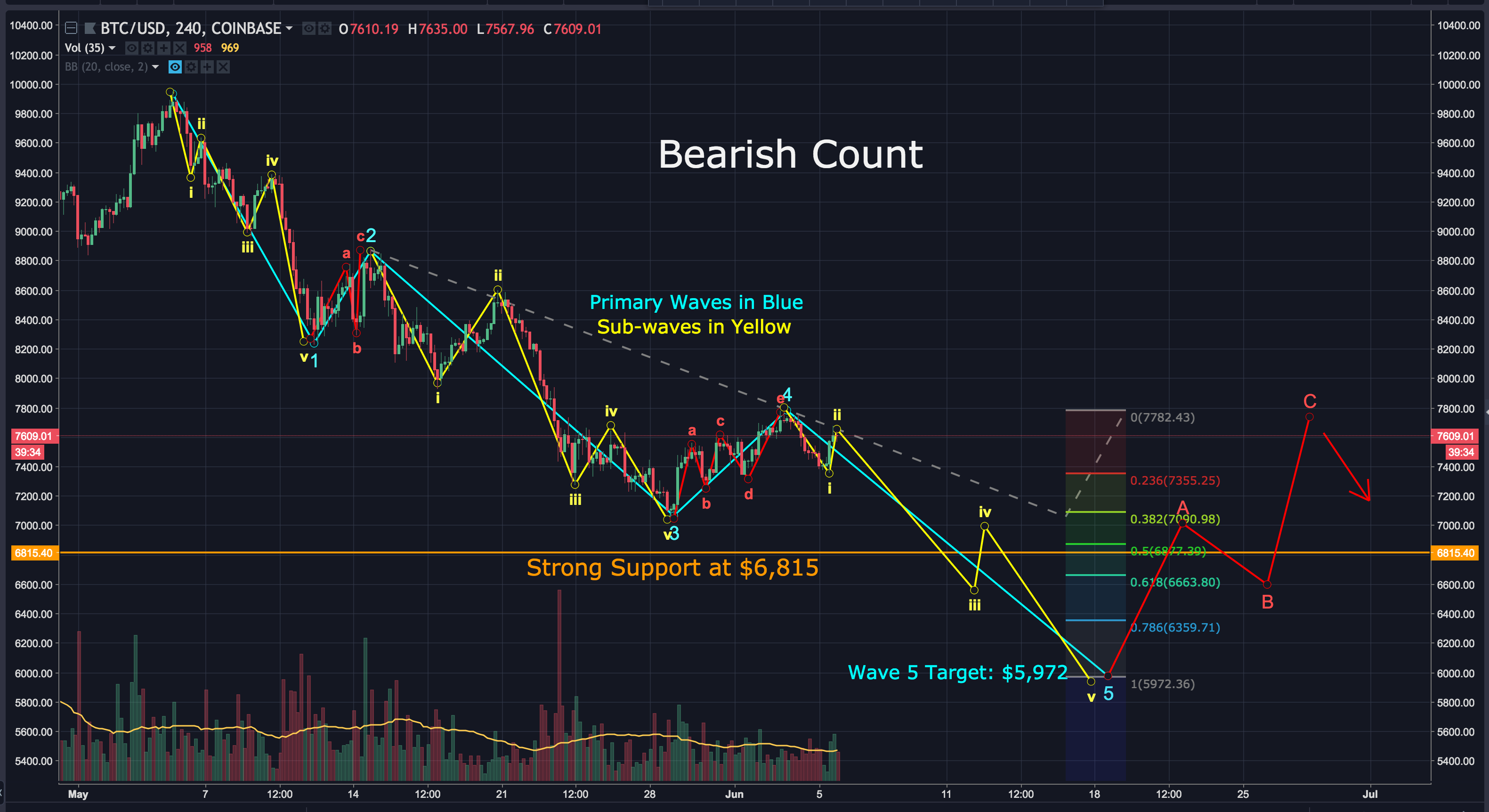 My bearish count has bitcoin in wave 5, of 5 waves down. I've highlighted the sub-waves in yellow. If bitcoin can penetrate the strong support at $6,815, the target for wave 5 would be $5,972.