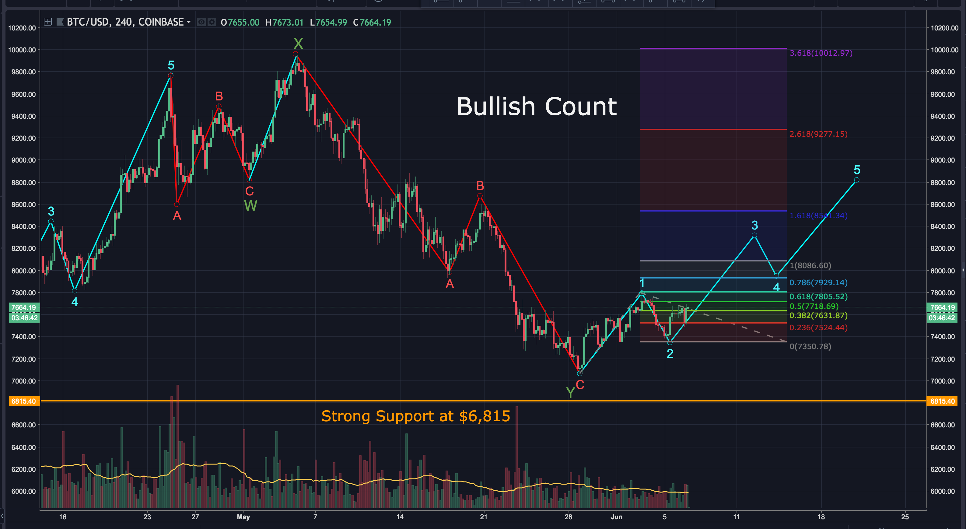 There's strong support at $6,815. The bullish count has bitcoin in wave 3, of 5 waves up. If this count is accurate, the target for wave 3 is approximately $8,300.