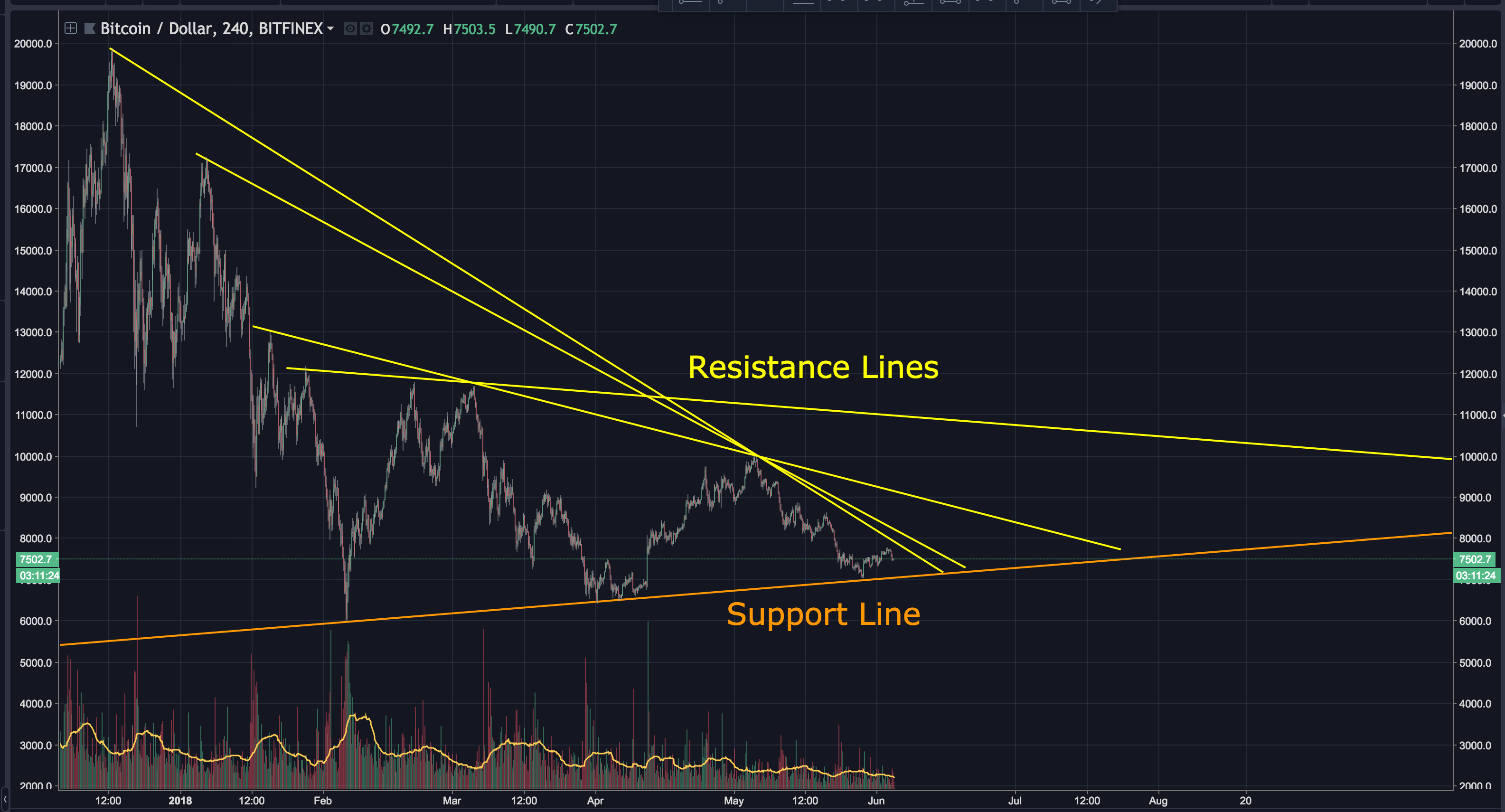 A few days ago, I pointed out 4 major areas of resistance bitcoin needs to break through. It's approaching the first. There's also a strong ascending support line making this slow uptrend possible. One of these is going to break in the next few days...maybe a week at most. If the support fails, the next area of strong support is at $6,815.