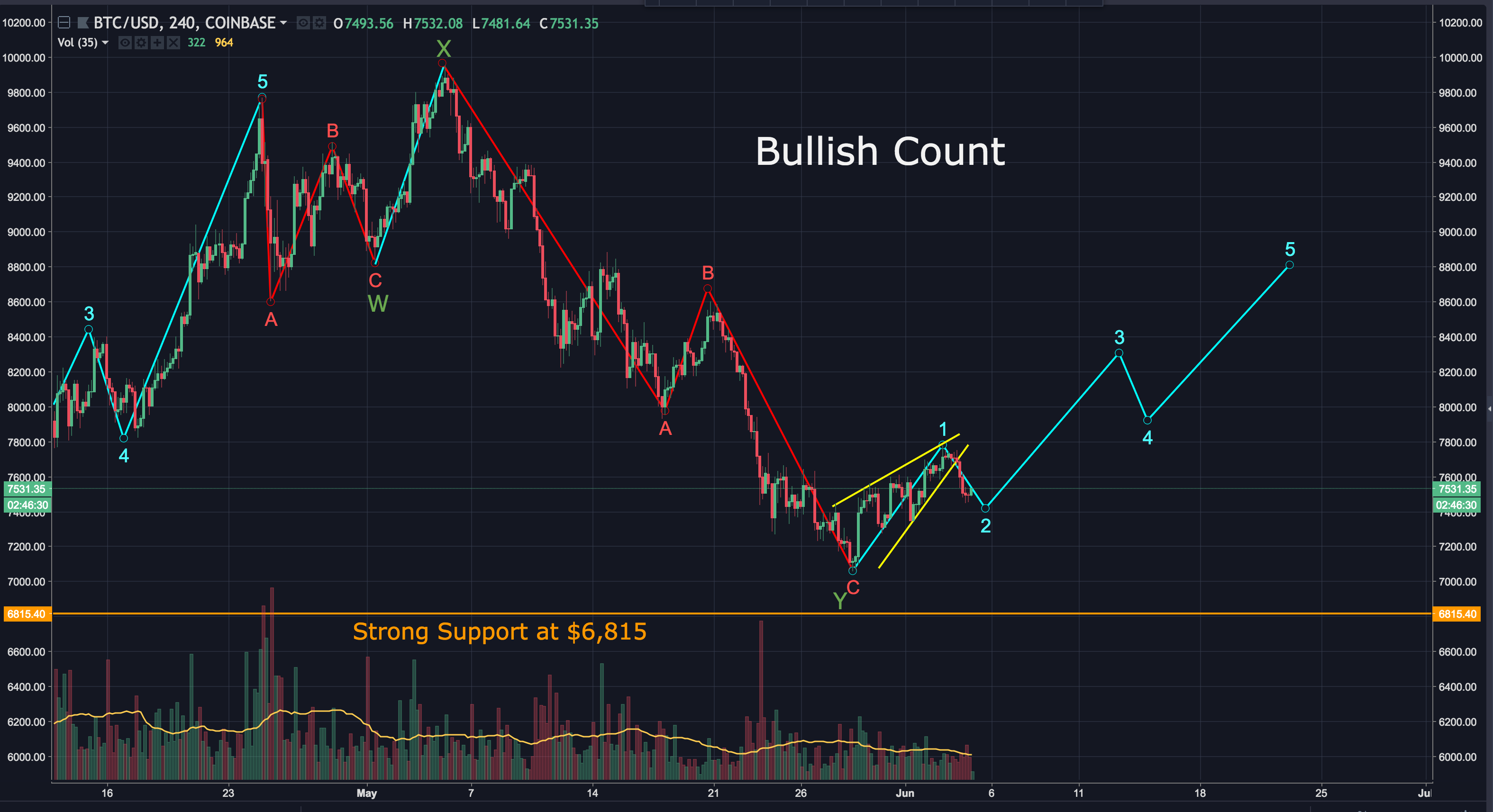 In order to continue the slow uptrend we've seen over the past few days, bitcoin must remain above $7,340. Dropping below would be another indication of a weakening market, and lend credibility to my bearish count.