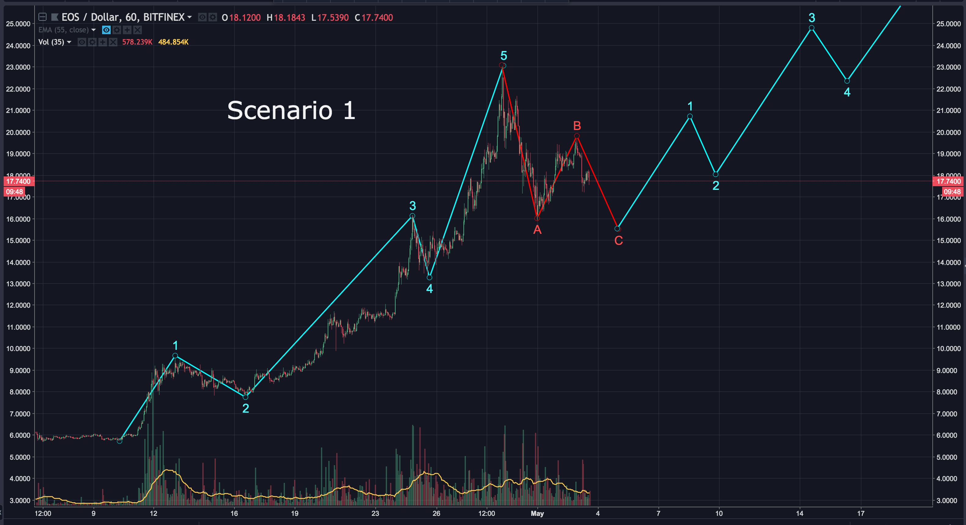EOS has been following the path I outlined for the past 24 hours. I can see the correction finishing up 2 different ways. The first is a little more bearish ABC pattern. If this is true, it may drop to approximately $15.00 to complete wave C. It would look something like this: