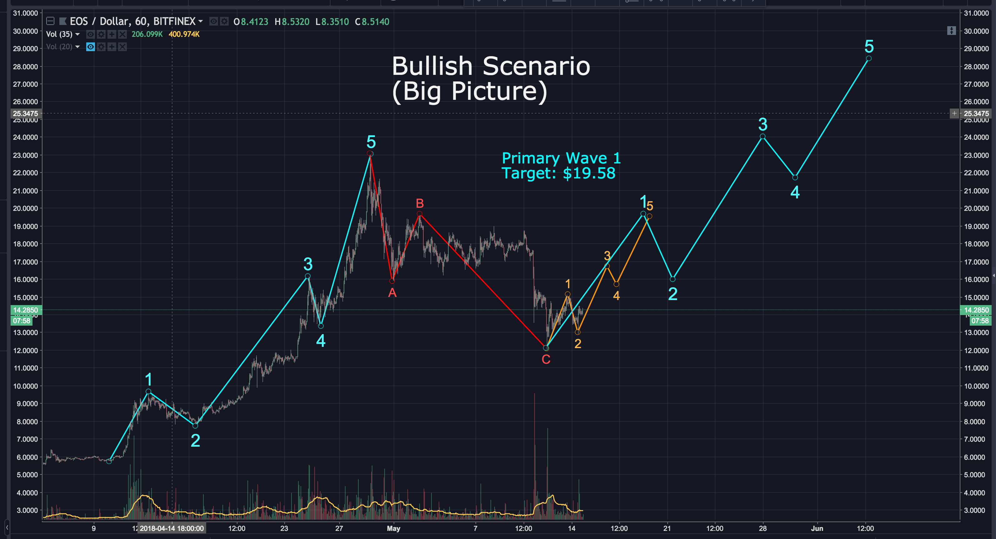 Zooming in, you can see the sub-waves. It looks as though sub-wave 2 is nearly complete, with sub-wave 3 currently underway. The target for sub-wave 3 is $16.70. I based that on a target between the 1.0 and 1.618 fibonacci level. Wave 3 is typically the strongest wave. This is especially true in an uptrend with EOS. Due to this, I targeted higher than the typical 1.0 fib level, but lower than the 1.618 as volume is still relatively weak for a third wave. That said, if this scenario is correct, wave 3 is just beginning. We could get a surge in volume at any point. It may play out like this: