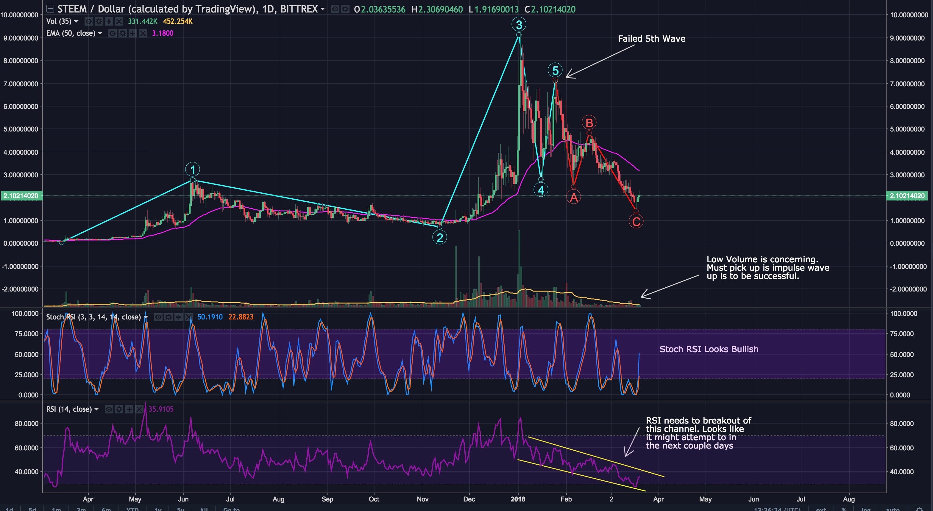 Looking at the daily chart, we can see Steem has a mixed signals. During its last bull run, it ended with a failed 5th wave.