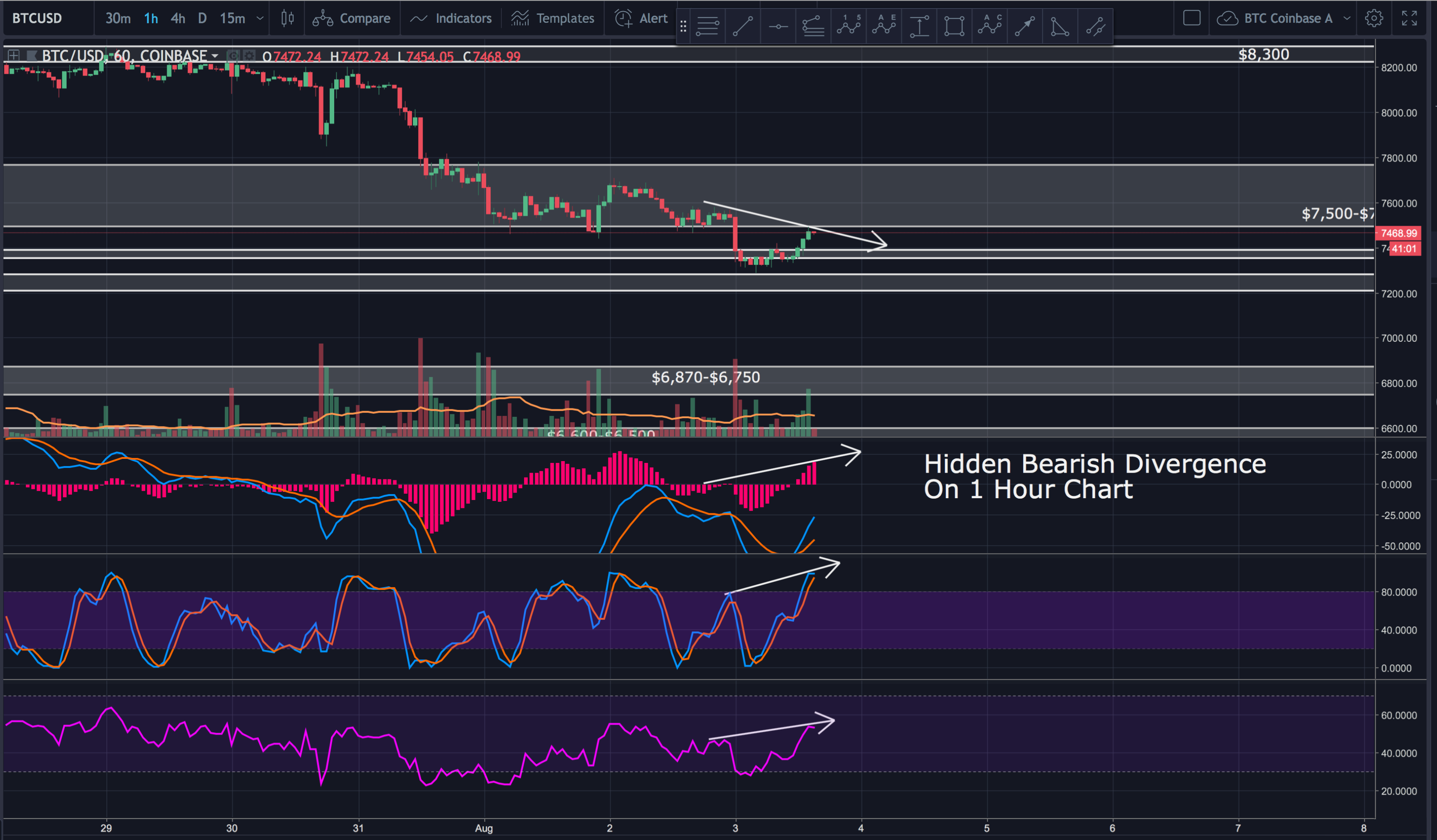 However, zooming into the 1 hour chart, we find hidden bearish divergence on the MACD, Stock RSI and RSI.