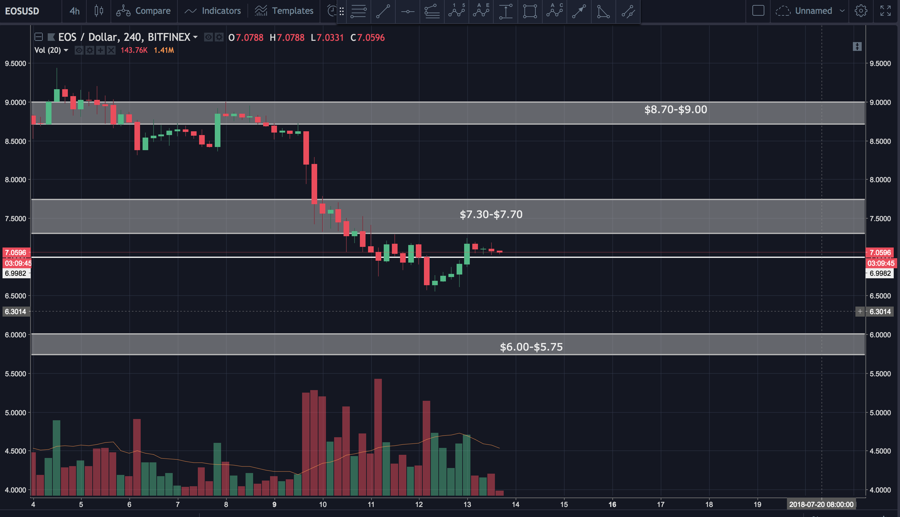 If price drops below the 0.618 fib, then we will likely test the prior low of around $6.50. This might set up a double bottom where we hit the low, and impulse up. However, if price drops below the $6.50 low, we may see it continue to the $6.00 support/demand zone.