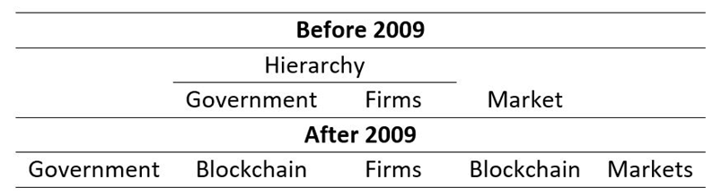 But blockchains also compete against firms and governments. The blockchain is an institutional technology. It is a new way to maintain a ledger — that is, coordinate economic activity — distinct from firms and governments.