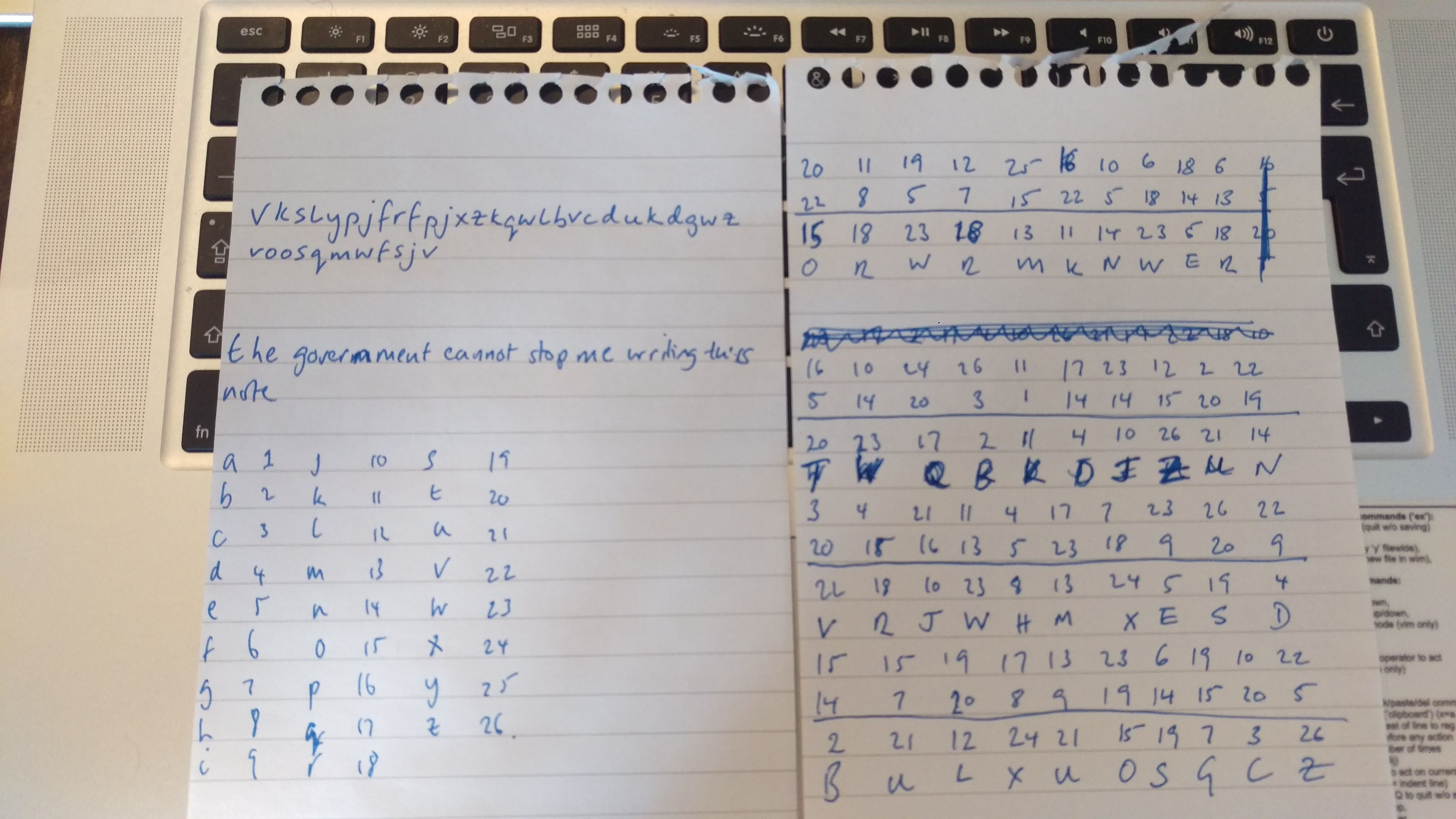 So what does the government do about this? They don't have any technological solution to the problem, and assuming they won't torture me, they can negotiate with me, spy on me, record my conversations, search through my bins to see if I wrote the original message (or the random string of letters down) and threw it away. But what's for sure, is they will not be able to break the above cipher without my assistance (whether I meant to give it to them or not).