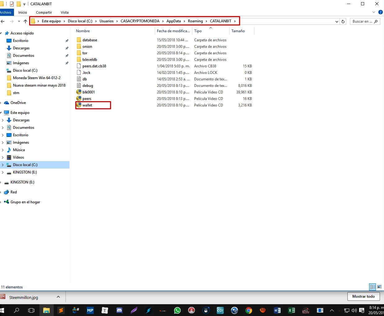 4.5.- Para restaurar la billetera se copia el archivo guardado y se pega en este mismo directorio C:\Users\AppData\Roaming\catalanbit\wallet.dat