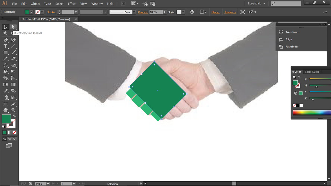 For the next logo, I used shapes to make a block image of a handshake using a reference photo. I use the direct selection tool to pull the corners of the shapes till they align with the photo.